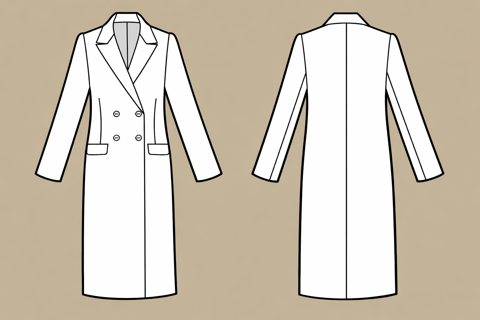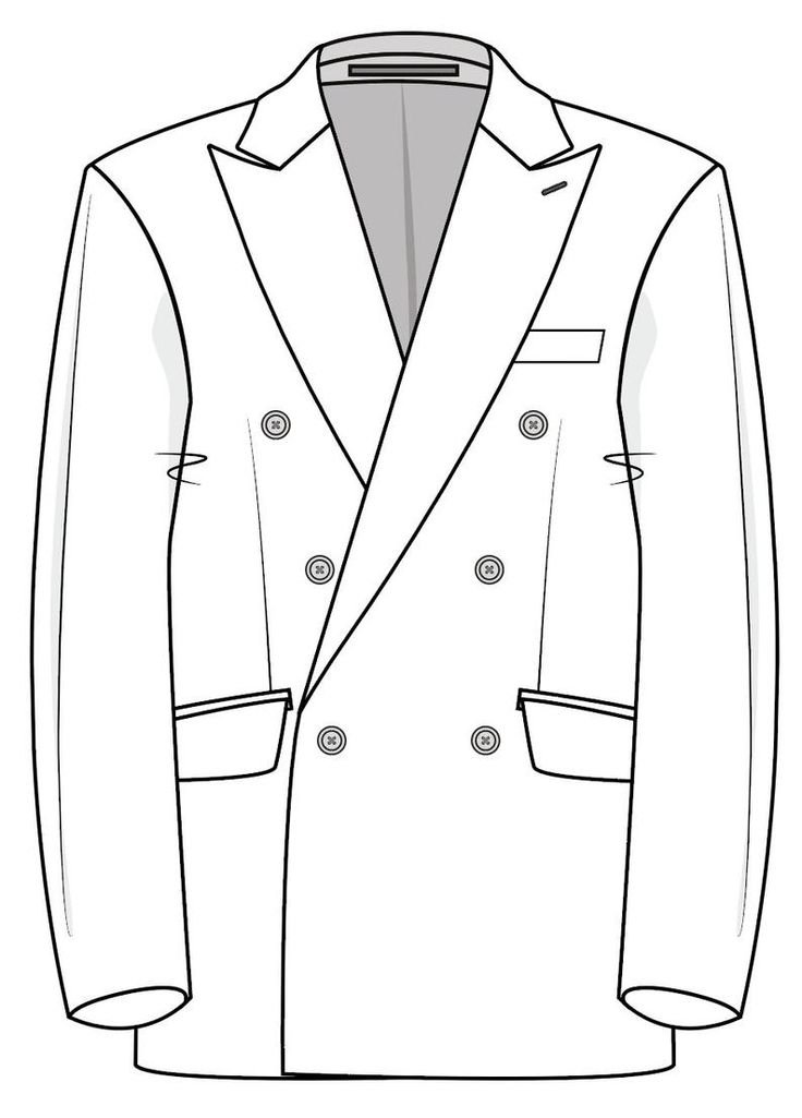 fot.: Rysunek techniczny z dokumentacji patentowej USA (US 3404408 A, 1968), domena publiczna. — Dwurzędowość jako architektura formy – guziki wyznaczają rytm, linia ramion prowadzi narrację sylwetki.