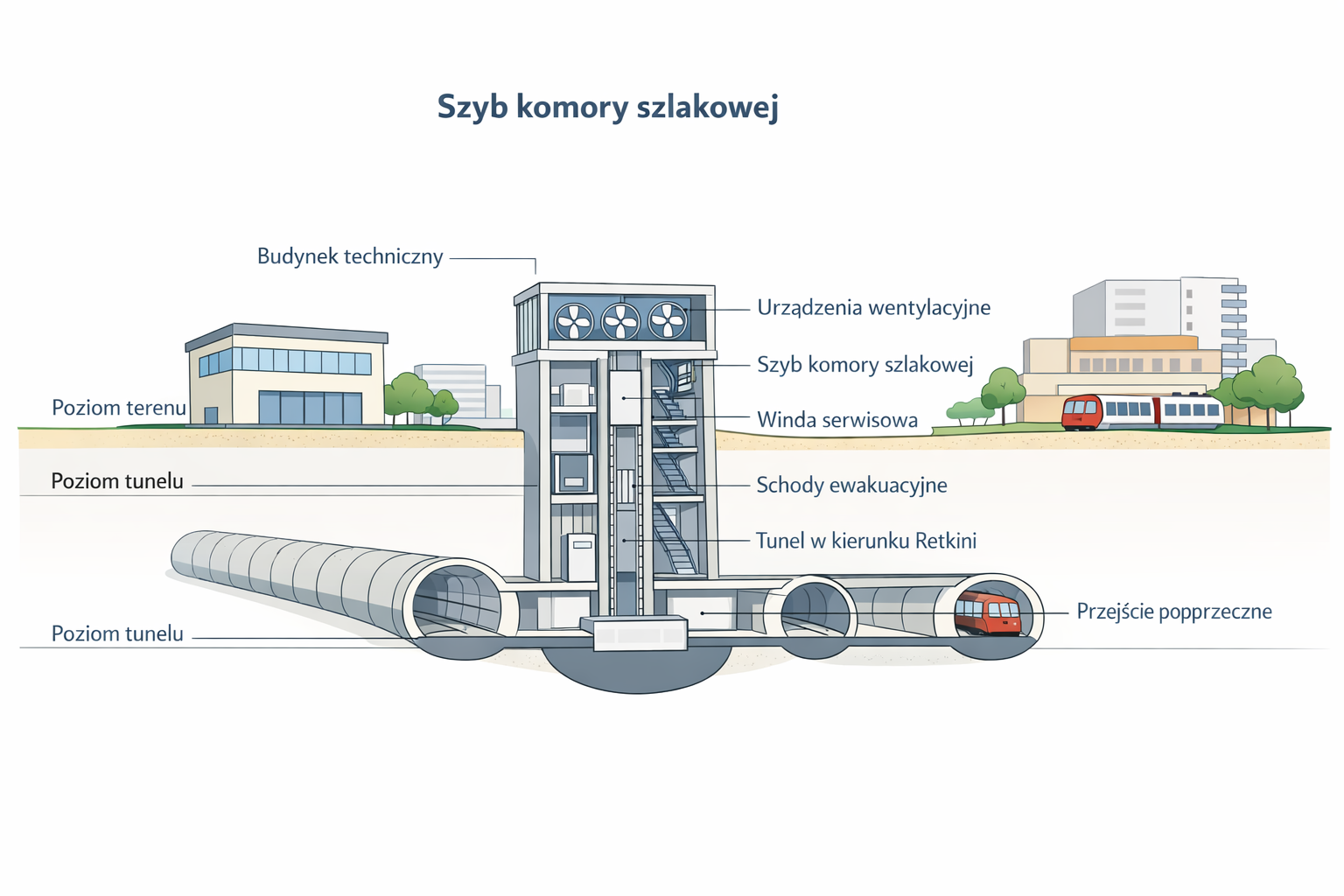 Grafika, którą pokazałeś, jest modelowym przykładem takiej konstrukcji: pionowy szyb, wentylatory, schody, winda, przejście poprzeczne między tunelami. Dokładnie tak będzie wyglądać komora K5, choć jej architektura naziemna zostanie dostosowana do łódzkich warunków.