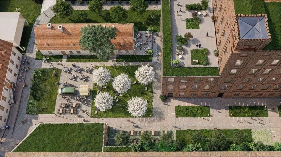 Projekt obejmuje łącznie dziesięć budynków — pięć zabytkowych i pięć nowych. Historyczne obiekty, w tym dawne ambulatorium, warsztat, portiernia i dom dyrektora, zostaną odrestaurowane i zaadaptowane na lokale gastronomiczne, usługi, biura oraz przestrzenie komercyjne. To właśnie one mają nadać inwestycji charakter i stworzyć naturalne centrum codziennego życia mieszkańców.