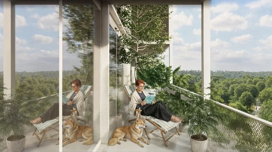 Projekt zakłada zachowanie 44,4% powierzchni biologicznie czynnej, co oznacza ponad 12 tys. m² zieleni. Między budynkami powstaną ogrody, alejki spacerowe, miejsca odpoczynku i przestrzenie rekreacyjne. Zieleń ma pełnić funkcję nie tylko estetyczną, ale też klimatyczną — obniżać temperaturę, poprawiać retencję wody i tworzyć przyjazne mikrośrodowisko dla mieszkańców.